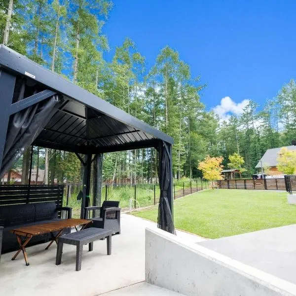 Pino-富士山麓-山中湖-新築貸切ヴィラ-蚊帳東屋BBQ無料-150平米ドッグラン付-小型犬3匹無料-長期滞在早期歓迎割引-バリアフリー ligger ca. 14 km fra Fuji-Q Highland og har en terrasse, balkon og udsigt til en have.