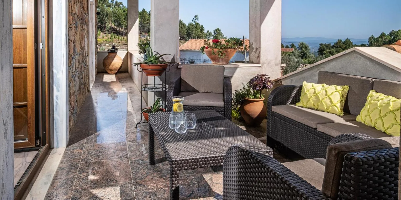 Alojamentos da Aldeia ligger ca. 50 km fra Museu Nacional Ferroviário. Her er balkon, kedel og bjergudsigt.