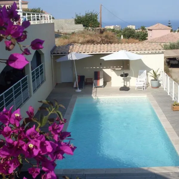 Studio moderne magnifique vue sur mer dans cadre calme et verdoyant heeft een buitenzwembad, een tuin, een terras, en biedt accommodatie in Furiani met gratis WiFi en uitzicht op de stad.