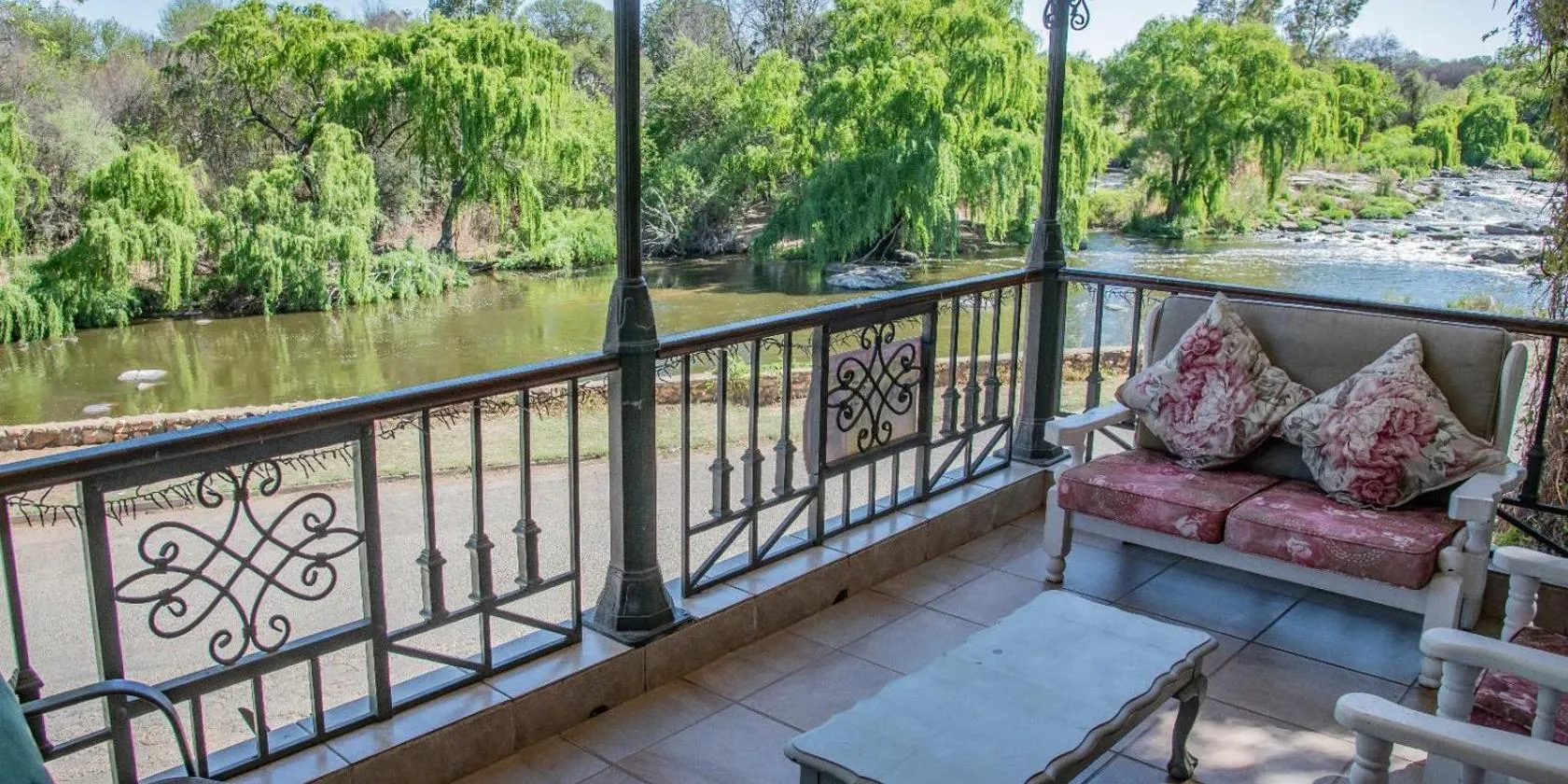 Megumi - Vaal Riverside Retreat - Loadshedding Friendly ligger ca. 7,3 km fra Parys Golf & Country Estate. Her er balkon, kaffemaskine og pooludsigt.