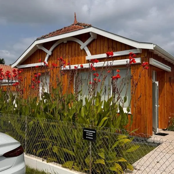 Chalet au coeur du bassin d' Arcachon avec accès gratuit Capfun ligger i Lanton. Her er en terrasse, gratis wi-fi og udsigt til en have.