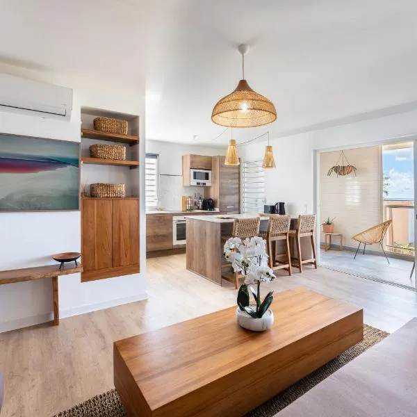 Duplex vue Mer, Piscines, Plages, Restaurants, Lagon, Jardin tropical, ligger i Saint-François med havudsigt. Her er en udendørs swimmingpool, en have og en terrasse. Der er også gratis wi-fi.