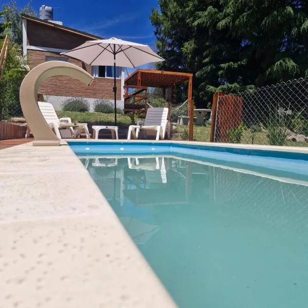 Cabaña de montaña con pileta en hermoso predio ligger ca. 42 km fra Brewer Park Villa General Belgrano og har en sæsonåben udendørs swimmingpool, balkon og udsigt til en have.