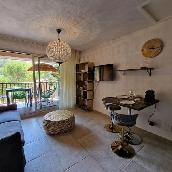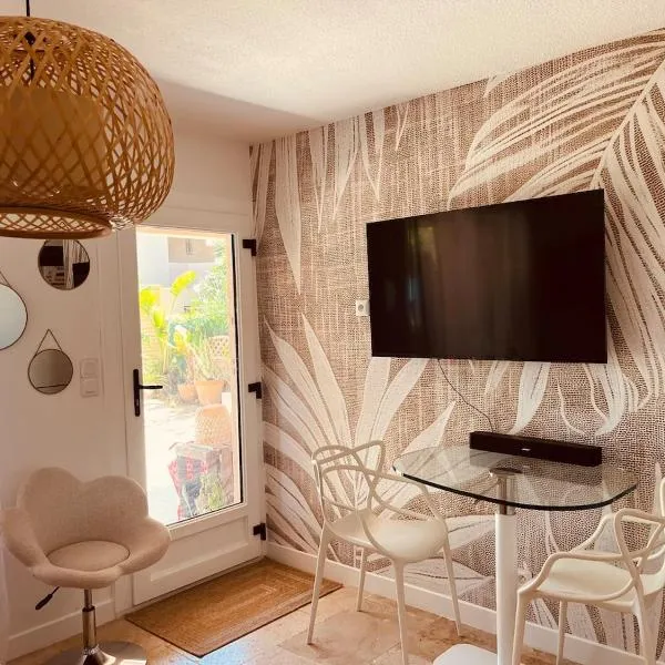 Beau studio, moderne, au calme avec piscine et parking privé dans une résidence arborée ligger i Sanary-sur-Mer. Her er en terrasse, gratis wi-fi og udsigt til en have.