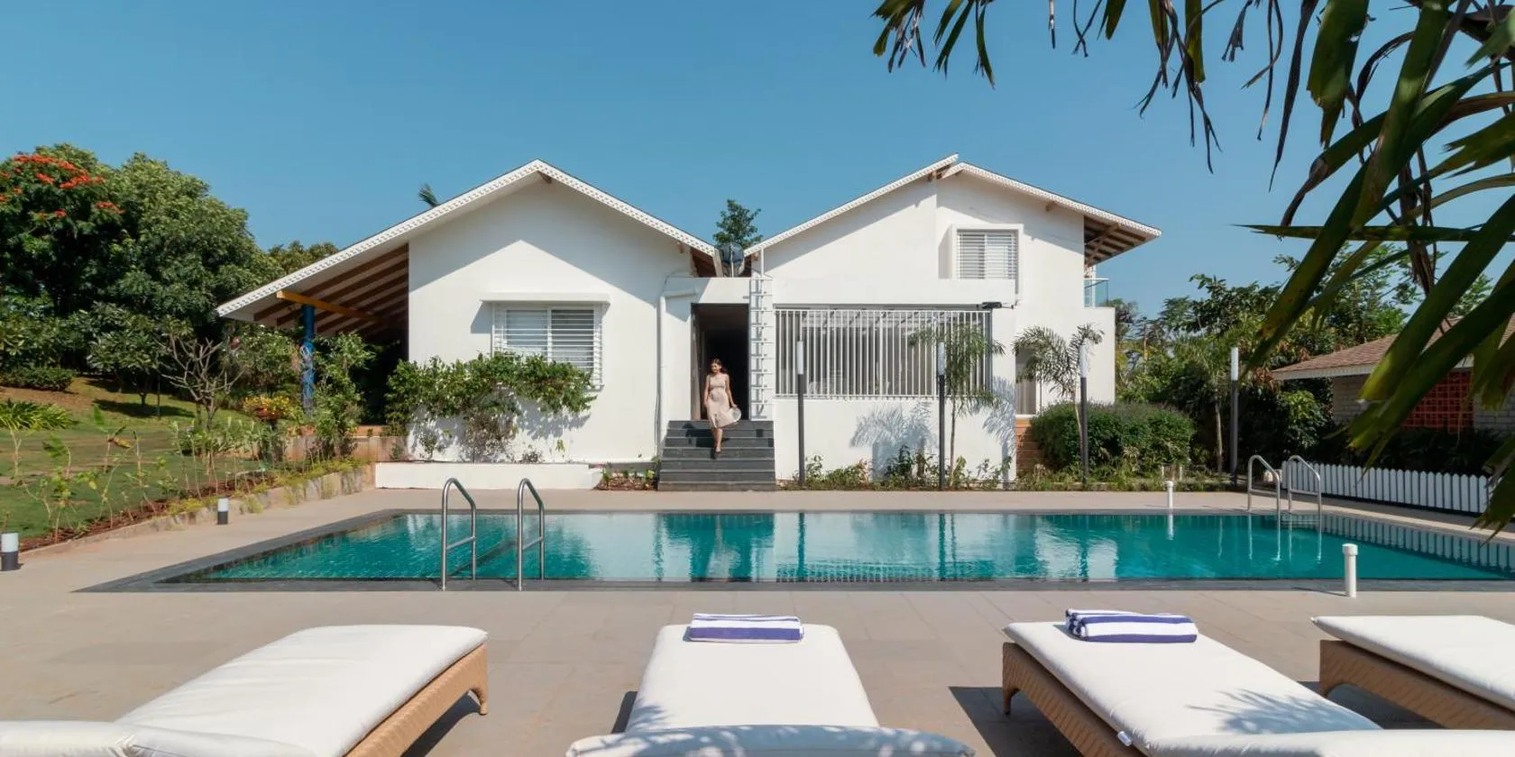 SaffronStays Amaltas, Nashik - pool villa with huge lawns perfect for large groups and corporate offsites beschikt over een buitenzwembad, een tuin, een gedeelde lounge, en biedt accommodatie in...
