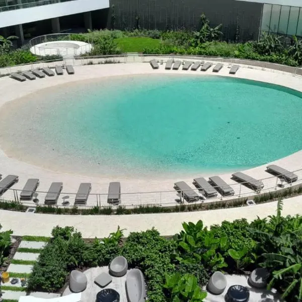 Departamento 3 amb para 5 personas con gimnasio, cochera y piscina ligger i Buenos Aires og har en terrasse udsigt til byen samt udsigt til en have.